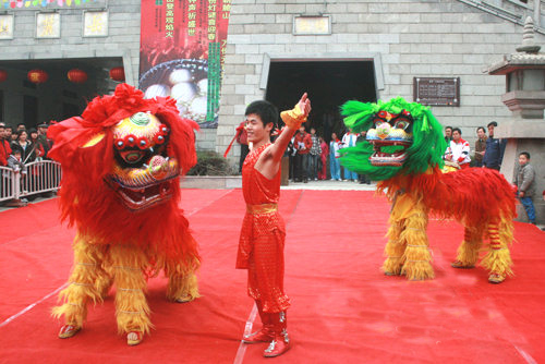 有布獅和毛獅兩種,舞時(shí)又分文獅和武獅。文獅刻畫獅子溫馴神態(tài),動(dòng)作詼諧細(xì)膩;武獅顯獅子勇猛,動(dòng)作幅度強(qiáng)。舞獅的套子有“藤纏樹(shù)”、“烏云蓋雪”、“牛戀凼”、“泥鰍彈鍋”、“麒麟送子”等。用打擊樂(lè)和吹奏樂(lè)伴奏、氣氛熱烈莊重。舞獅時(shí)還有贊獅者伴唱,唱詞內(nèi)容有反映勞動(dòng)生活、祝賀吉祥、介紹傳說(shuō)故事等,舞獅者隨唱詞內(nèi)容和節(jié)奏進(jìn)行表演。