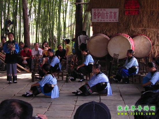 進入鳳凰香爐山苗寨必須過三道關:一是去剿匪,二是對山歌,三是喝三碗米酒。如果過不了這三道關,是不能進寨子的。剿匪就是過一道山洞(當年土匪躲藏的地方),也就是拍攝電影《湘西剿匪記》的現場,洞內驚險崎嶇,道路難走,還要過一條河,河面上的橋是用小木板釘成,僅一米寬,上面滴水,橋上很滑,橋下流水很急。