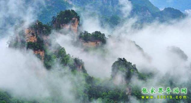 鷂子寨頂北沿有數(shù)處懸崖凌空凸出如臺(tái)。立臺(tái)鳥瞰,深谷陡峭如切,深達(dá)300多米,谷內(nèi)數(shù)十座石峰拔地而起,有如塔林。峰壁有的赭紅,有的灰白,均有節(jié)理橫斷,層次重疊。峰林直徑大者十多米,小者數(shù)米,或高或低,參差錯(cuò)落。有的上粗下細(xì),有的下大上尖,有的渾圓平齊,陽光照射下均熠輝閃爍。峰頂或老松一叢,蒼勁挺拔,或灌木一片,蒼翠簇?fù)?。雨天云霧如濤,峰頂懸浮。此景即清乾隆《永定縣志》所記之“層巖涌塔”。