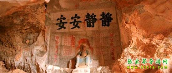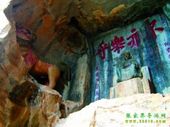 玉皇洞石窟位于張家界城西約7公里的麻空山南壁,為清代本地鄉(xiāng)紳李京開獨(dú)資捐修。李京開又叫李五瑞,別名九洞樂,號識破生。他生于乾隆七年(公元1742年),道光乙酉年(1825年)去世,享年83歲。李先生家道殷實(shí),富甲一方。少時勤奮讀書,頗有才華,數(shù)十年奔波仕途,但屢試不第,官場無望,于是看破紅塵,另尋安慰,請工匠,耗巨資,憑借麻空山天然溶洞,按上、中、下方位布局,巧妙構(gòu)思,開鑿成“天堂”、“人間”、“地府”三層共八個洞。另外,在離此約3公里的峰泉洞另鑿一洞,故有“九洞樂”別名。玉皇洞石窟上層為玉皇洞,人間層有玉金洞、毫筆洞、墨池洞、虎龍洞、雄獅洞、孔圣洞,地府為因果洞,八洞組成一個完整的混沌世界。居八洞之首的玉皇洞,雕有玉皇大帝神像,意為“天堂”至尊,統(tǒng)帥中層的“人間”和下層的“地府”,故八洞統(tǒng)稱玉皇洞。此洞于1799年動工,到1807年完成,歷時八年。洞內(nèi)雕鑿了一些歷史人物的神像以及大量詩詞匾對,不僅石雕精湛獨(dú)特,雕像神韻生動,書法遒勁大氣,而且在石窟藝術(shù)的主題構(gòu)思上,抒發(fā)了主持捐修者李京開懷才不遇、憤世疾俗、向往太平盛世的情感,鞭達(dá)了腐朽的科舉制度,對于研究清代社會和科舉制度,以及當(dāng)時一般讀書人的思想情感,都具有一定的史料價值。整座洞窟東西長300余米,現(xiàn)存石像19尊,石刻50多處,是湖南省唯一保存完好的石窟藝術(shù)群,1959年玉皇洞被列入湖南省重點(diǎn)文物保護(hù)單位。