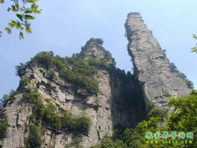與金鞭巖隔溪對峙,矗立在斜坡上,高200余米。上下粗細一般,峰體渾圓,色赤,呈70度角向金鞭溪傾斜,形似醉酒羅漢,欲倒不倒,似醉非醉,詼諧幽默。清嘉慶學士彭之臣在峰壁書寫一“忠”字。清道光四年(1824),貢生彭之運作《壁忠記》譯文以彰其勝。風雨蒼桑,“忠”字因山石崩塌遭毀,《記》存于當?shù)刂緯小?/p>