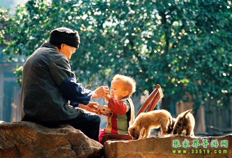 孩子們自從娘胎里出來,父母們就給備好了一首首童謠。在襁褓中時,有簡短的搖籃曲。“我的小寶貝,睡吧快快睡,你莫哭,快長大,我的小寶貝”,伴以“喲嗯”之類的喉音和鼻音。哭鬧的孩子在這低低的吟哦中,在這輕柔的春風中,會緩緩的走入夢鄉(xiāng)。到孩子牙牙學語時,就會換上新的內(nèi)容。為讓孩子從小懂得廉恥,大人會教孩子《蟲蟲兒飛》:“打板板,逗蟲蟲兒,蟲蟲兒飛,飛到嘎兒(外公)去。嘎兒不趕狗,咬到蟲蟲兒的手;嘎兒不殺雞,蟲蟲兒不回去;嘎兒不打蛋,蟲蟲兒不吃飯;嘎兒不殺鵝,蟲蟲兒不過河。”(土家把孩子名字叫得賤,喊成“蟲蟲兒”)。在唱的同時手把手地教孩子做蟲蟲飛的動作。唱完后,又會用手指點點孩子的左右臉,刮一下孩子的鼻子,“這兒也丑,那兒也丑,鼻子刮豬油。”意思是好吃是丟臉的,蟲蟲兒可不能這樣。勤勞是做人的根本,也是土家人的傳統(tǒng)美德,“三歲看大,八歲看老”,大人會教些勤勞的童謠。《賣豆腐》道:“一顆豆子圓又圓,推成豆腐賣成錢,別人講我生意小,小小生意賺大錢。”為讓孩子自小懂得親疏,教孩子《推磨》:“推磨拐磨,推的粑粑白不過。推粑粑,接嘎嘎,嘎嘎不吃娃娃的酸粑粑;推豆腐,接舅舅,舅舅不吃娃娃的酸豆腐;推合渣,接姨媽,姨媽不吃娃娃的酸合渣……”夏日的夜晚,一家人出來在月亮地里歇涼,有夜火蟲(螢火蟲)舉著火把飛來,母親會以夜火蟲打頭,以“一問一答”的聯(lián)句方式,考考孩子的記憶力:“夜火蟲,夜夜來,嘎婆接你吃茶來。什么茶?豆茶。什么豆?黃豆。什么黃?朱砂黃……”