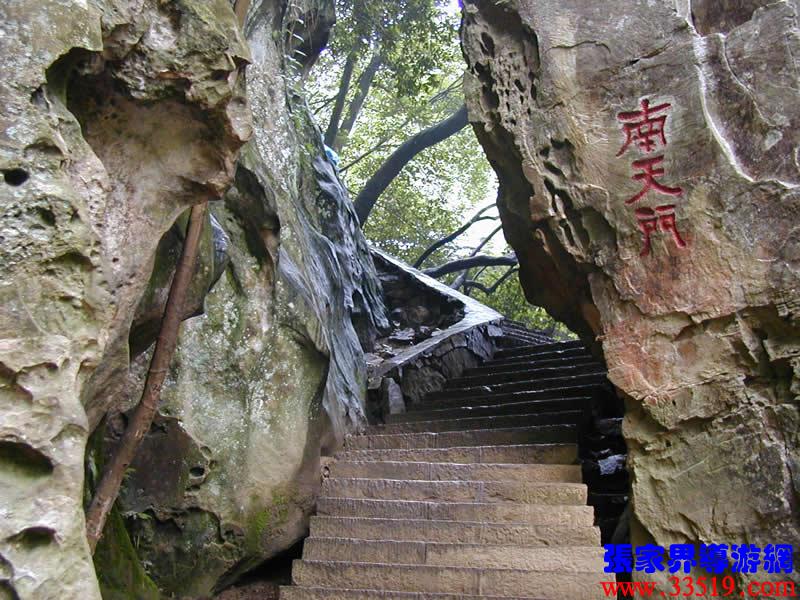 (南天門)(前行20米)現(xiàn)請大家抑頭望,可見一洞門,此門高約30米、寬4米左右,由游道兩側(cè)的兩座石峰斜傾拱峙而成。門右邊不遠(yuǎn)處一峰高約20米,峰頂如人頭,有臉有面,似把門將軍。