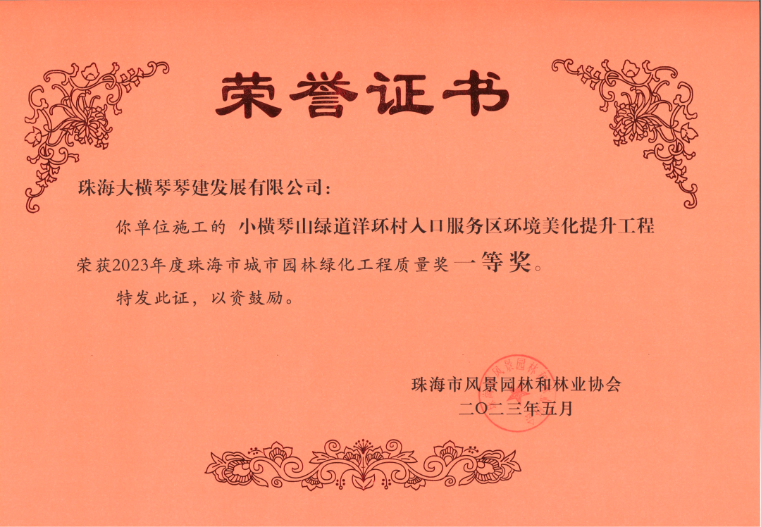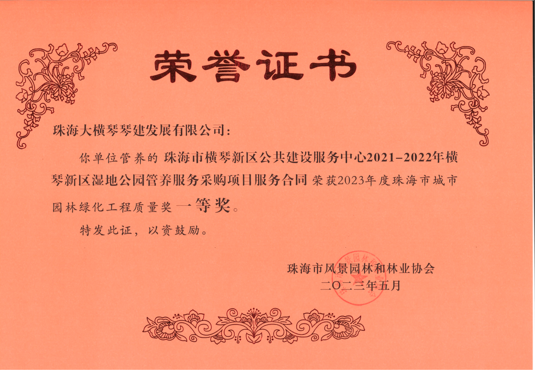 近日,珠海大橫琴琴建發(fā)展有限公司、珠海市橫琴新區(qū)公共建設(shè)服務(wù)中心,2021-2022年橫琴新區(qū)濕地公園管養(yǎng)服務(wù)采購項目服務(wù)合同,小橫琴山綠道洋環(huán)村入口服務(wù)區(qū),環(huán)境美化提升工程,以及作為代建單位負責(zé)建設(shè)的古樹名木公園(粗沙環(huán))項目,榮獲由珠海市風(fēng)景園林和林業(yè)協(xié)會頒發(fā)的2023年度珠海市城市園林綠化工程質(zhì)量獎一等獎。