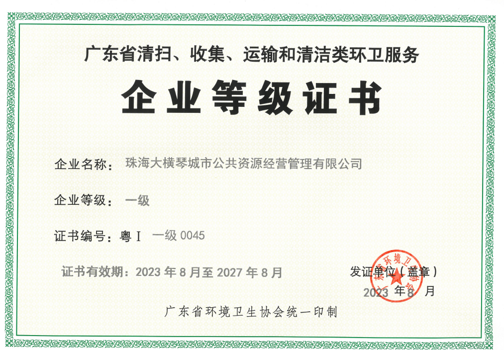 2023年,大橫琴城資榮獲“廣東省清掃、收集、運(yùn)輸和清潔類(lèi)環(huán)衛(wèi)服務(wù)企業(yè)”一級(jí)評(píng)定和珠海市“十佳環(huán)衛(wèi)(垃圾分類(lèi))企業(yè)”稱(chēng)號(hào)。