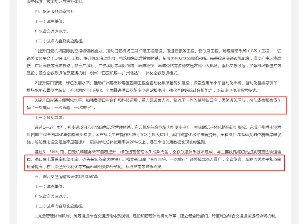 預(yù)期通過3—5年時(shí)間,實(shí)現(xiàn)白云機(jī)場(chǎng)服務(wù)效率顯著提升,綠色運(yùn)營管理體系成熟完備,空鐵聯(lián)運(yùn)體系基本建成,與主要鐵路樞紐站點(diǎn)實(shí)現(xiàn)直達(dá)軌道連接;港口岸電覆蓋率和使用率、碼頭裝卸效率大幅提升;橫琴口岸“合作查驗(yàn)、一次放行”通關(guān)模式深入推廣,全省旅客、車輛通關(guān)水平和效率顯著提高,在口岸通關(guān)便利化等方面形成相關(guān)指導(dǎo)意見、標(biāo)準(zhǔn)指南等政策成果。