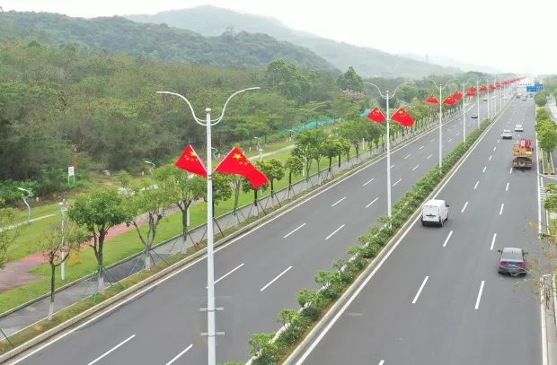 鮮艷的五星紅旗迎風(fēng)招展,與藍(lán)天白云相映成輝,為道路注入莊嚴(yán)喜慶、歡樂(lè)祥和的節(jié)慶氣息。