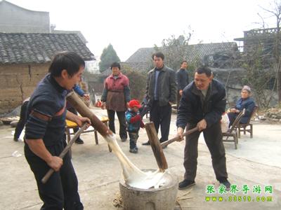 土家人民素有“二十八,打粑粑”的說法。每逢春節(jié)來臨,農(nóng)歷臘月末,家家都要打糯米糍粑,所謂打糯米糍粑,據(jù)當(dāng)?shù)剜l(xiāng)土志書記載:“系糯米飯就石槽中杵如泥,壓成團(tuán)形,形如滿月。大者直徑約尺5,尋常者約4寸許,3至8分厚不等。”打糯米糍粑是一項(xiàng)勞動(dòng)強(qiáng)度較大的體力活,一般都是后生男子漢打,兩個(gè)人對(duì)站,先揉后打,即使冰雪天也要出一身汗。做粑粑也很講究,手粘蜂臘或茶油,先出砣,后用手或木板壓,要做得玉圓光滑,講究美觀。