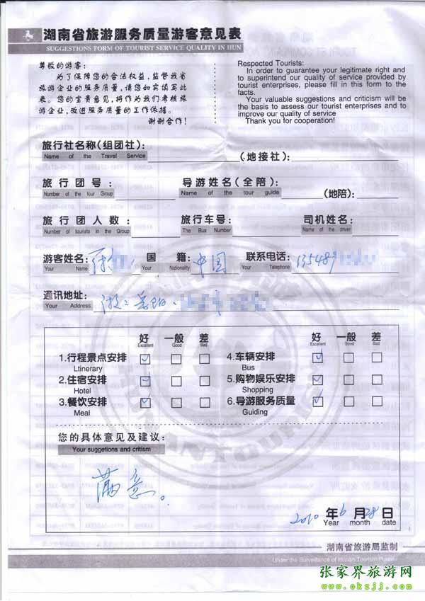 2010年6月28日岳陽符先生旅游質(zhì)量反饋