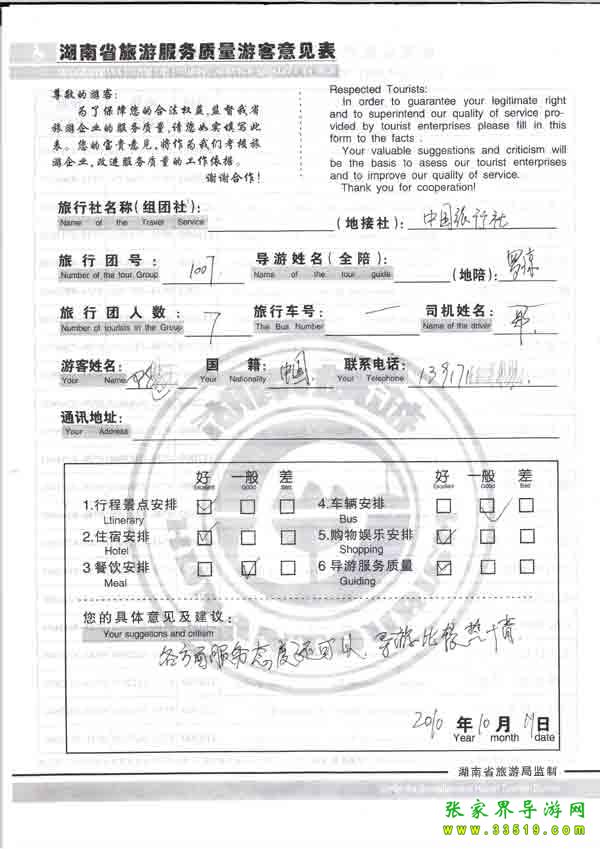 2010年10月11日陳先生一行7位旅游質(zhì)量反饋:導(dǎo)游比較熱情